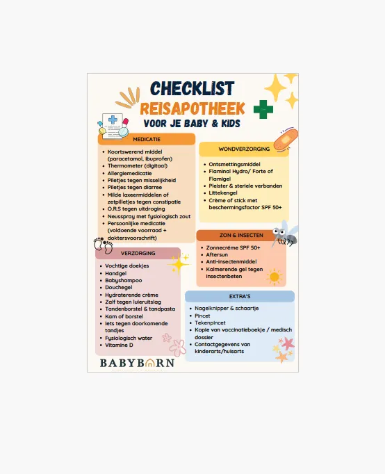 Op vakantie gebeuren er altijd dingen die je thuis minder snel meemaakt. Je trekt een bergwandeling in? Grote kans dat er knietjes openvallen. Een tropische mug vindt nét jouw baby het lekkerst. En net wanneer je écht wil genieten, krijgt je kleintje plots koorts of buikloop. Met een slimme reisapotheek sta je niet machteloos: alles wat je nodig hebt netjes in één tasje. In dit artikel lees je wat écht handig is om mee te nemen – en je kan de checklist gewoon downloaden.